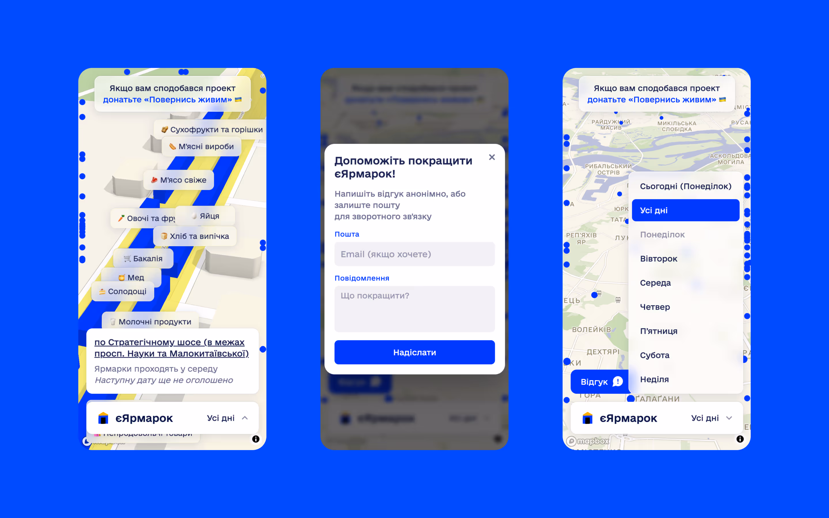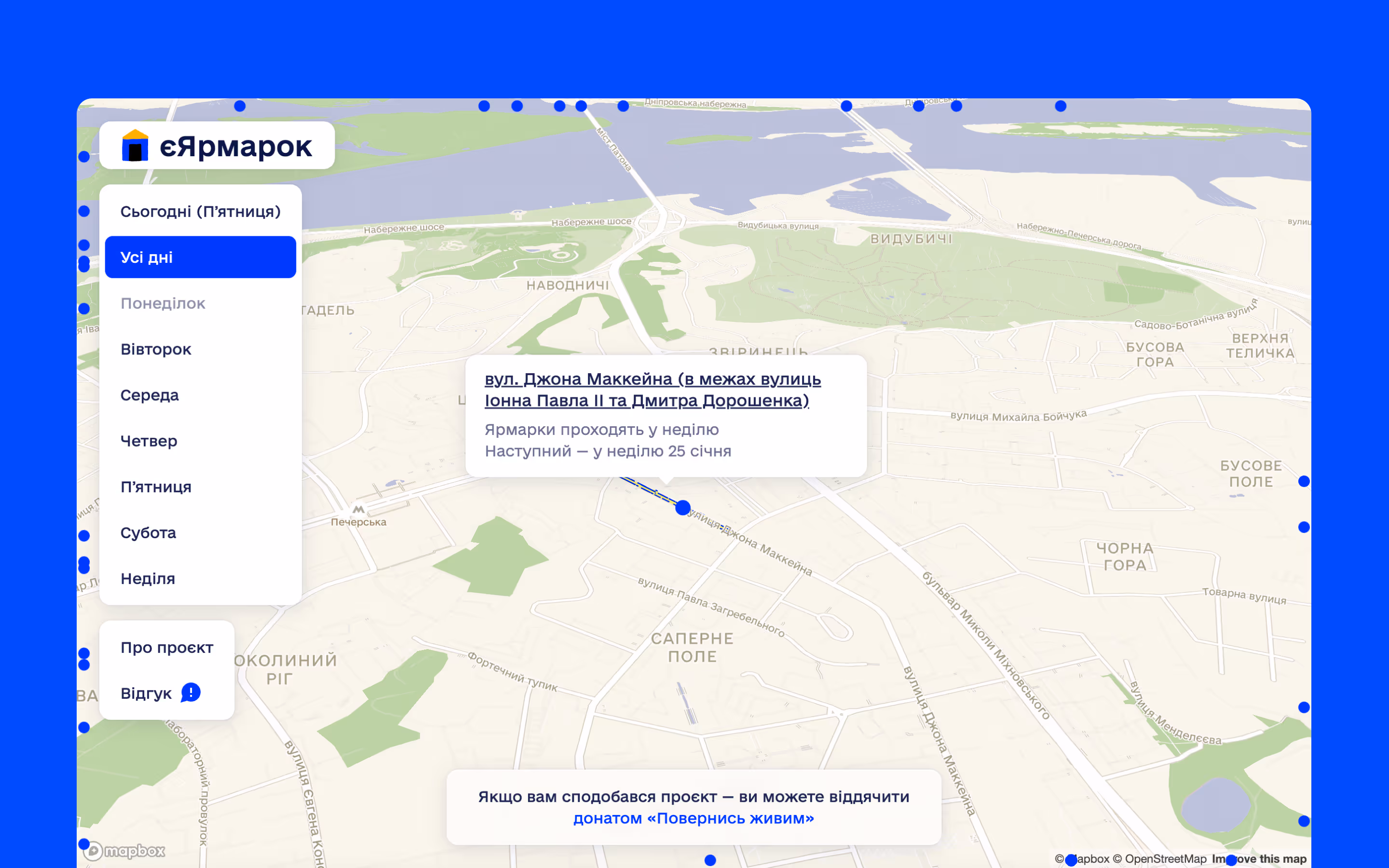 Інтерактивна карта, де ярмарки можна побачити в просторі, відфільтрувати за днем тижня, та знайти найближчий до себе. Із системою фідбеку та базовою Google-аналітикою